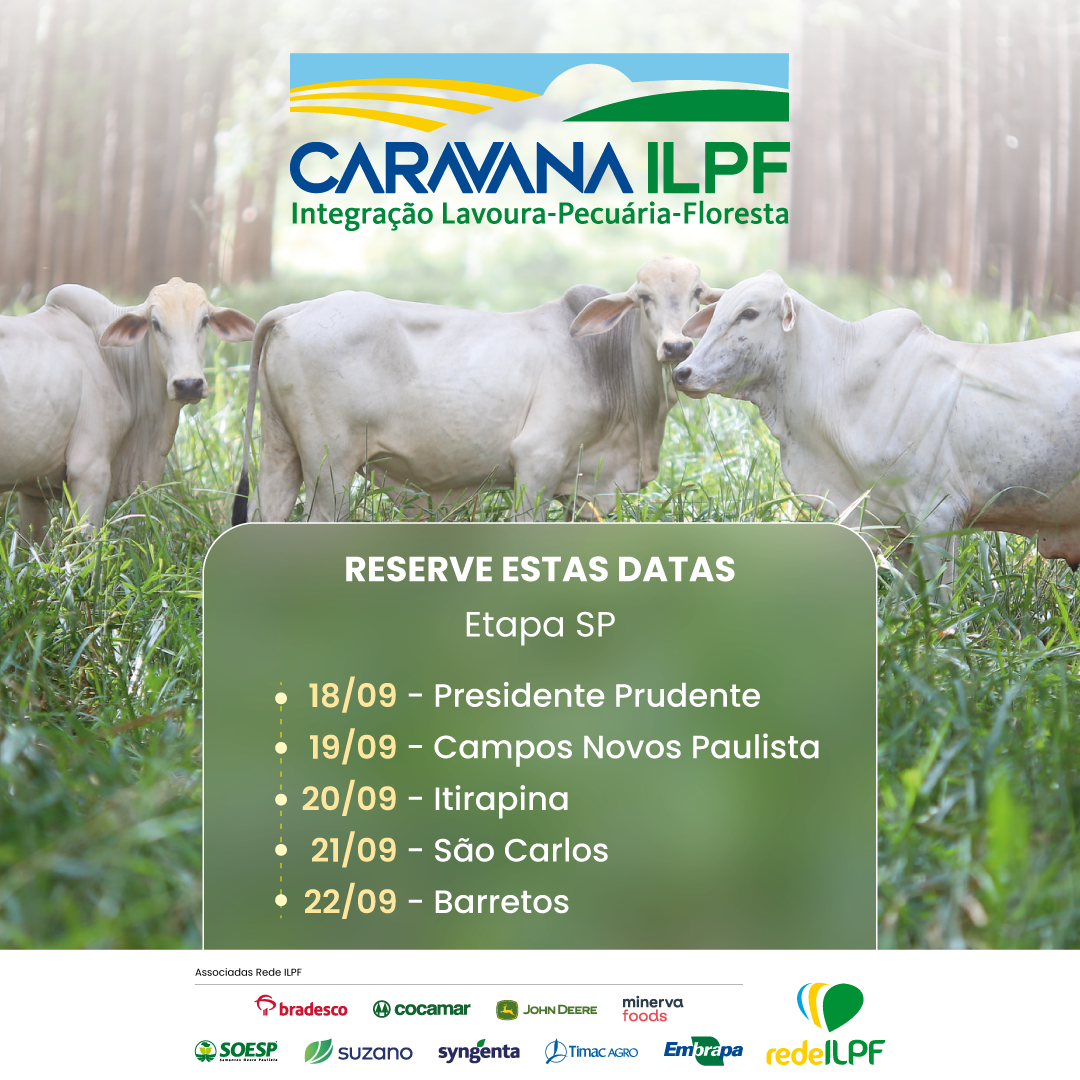 A etapa São Paulo da Caravana ILPF será de 18 a 22 de setembro e vai passar pelas cidades de Presidente Prudente (18), Campos Novos Paulista (19), Itirapina (20), São Carlos (21) e Barretos (22), com visitas técnicas a fazendas, dia de campo e palestras técnicas.